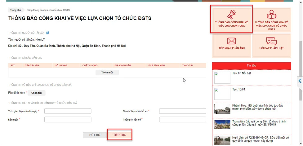 Sau khi đăng nhập thành công, Người có tài sản chọn [THÔNG BÁO CÔNG KHAI VỀ VIỆC LỰA CHỌN TCĐG] tiến hành nhập thông tin theo mẫu (những trường thông tin có dấu * là bắt buộc nhập). Sau khi nhập đầy đủ thông tin, nhấn Tiếp tục.
