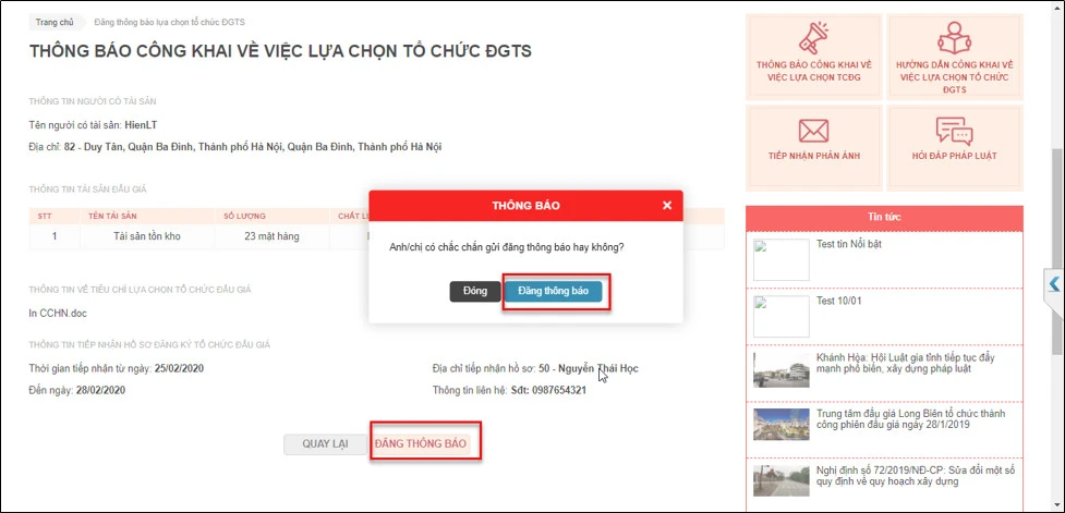 Hệ thống hiển thị giao diện xác nhận thông tin. Người có tài sản xác nhận lại thông tin, tiến hành đăng thông báo
